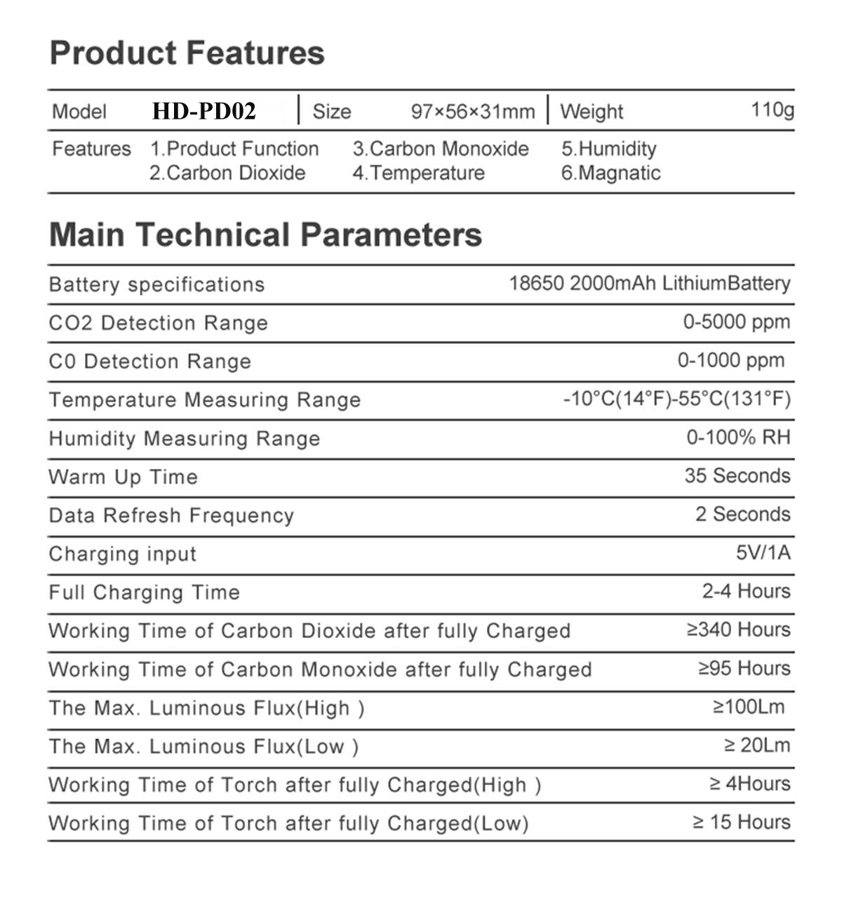 HD-PD02 Portable 4-in-1 CO&CO₂Detectors with Torch